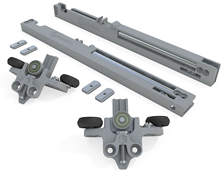 Conjunto de guia e sistema de amortecimento que proporciona um fechamento de porta mais leve e suave, além de trazer um sistema de antidescarrilamento, dando mais segurança para suas portas.